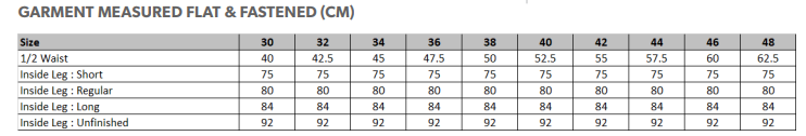 Half hem width at waist size 34" = 19cm