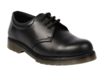 Black smooth leather safety shoe. Padded collar for added comfort. Steel toe cap protection. Moisture wicking inner lining. PVC air cushion outsole. A lightweight uniform safety shoe for lighter duties, factory or warehouse type work.
